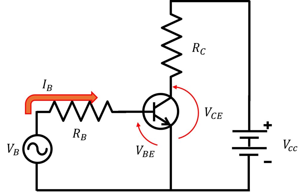 ①ベースエミッタ回路に電圧を加えます。するとダイオード特性に従ったベース電流が流れます。