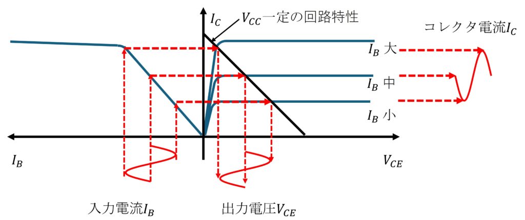 はじめに電圧増幅の原理を示す全体像のグラフを図2に示します。トランジスタは活性領域を利用して運転させます。