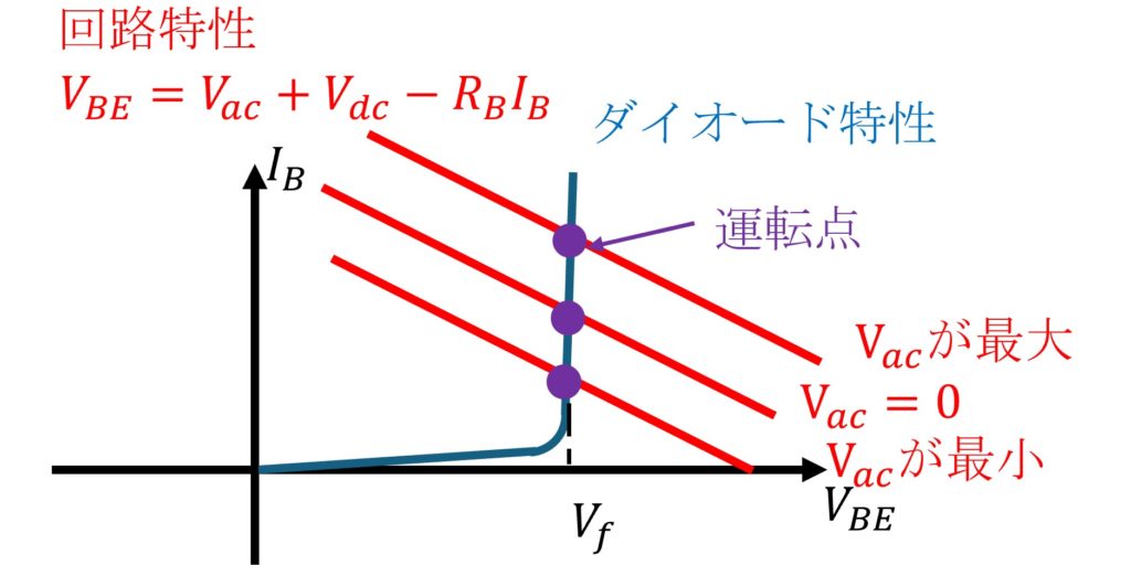 ダイオード特性とベースの閉回路の特性から運転点が決まる