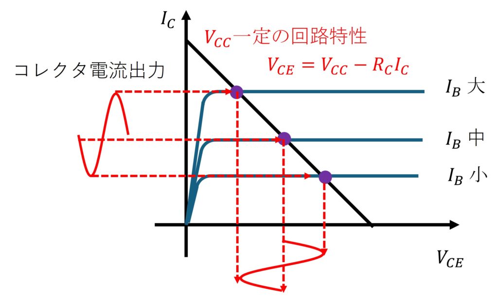 - ベース電流とコレクタ電流の増幅特性を利用します。活性領域で運転していれば、電流増幅率が安定しているため、正弦波上のコレクタ電流を取り出すことができます。