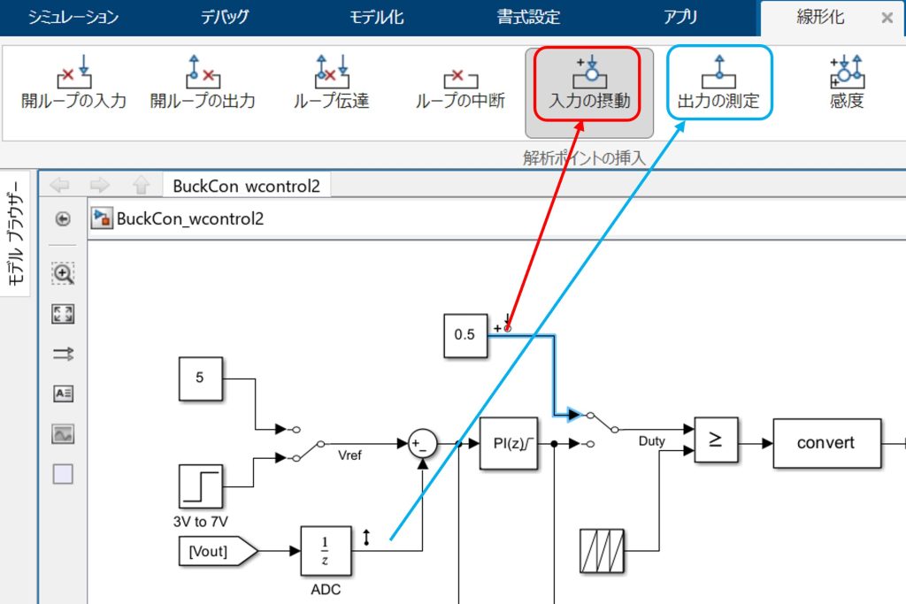 線形化マネージャーを開くと上側に、ツールが表示されます。図11のとおり、Duty信号に対して入力の摂動を、UnitDelay出力に対して出力の測定を設定します。設定すると図中のとおり、入力の摂動・出力の測定を示すアイコンがモデル上に表示されます。これで、解析I/Oの設定は完了です。