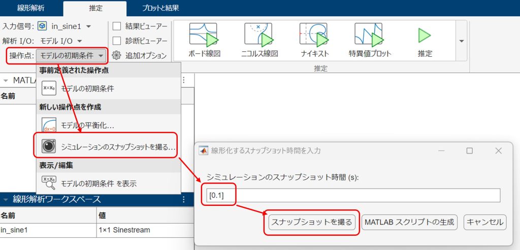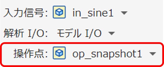 「スナップショットを撮る」をクリックすると、シミュレーションが動作し、操作点(t = 0.02s)の状態を取得してくれます。動作が完了すると図13のとおり自動で操作点に反映してくれます。これで操作点の設定は完了です。