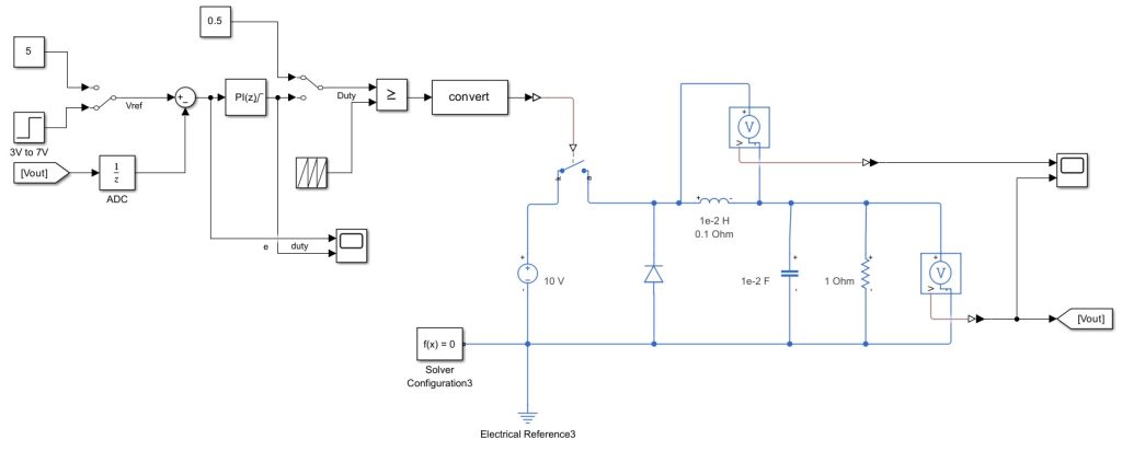 降圧コンバータのブロック線図は図1のとおりです。プラントはPI制御器出力のDutyを入力とし、Dutyに応じた電圧値を出力します。このとき、入力されるDutyと出力される電圧の間の関係はプラントにより異なります。したがって、PI制御器においては、このプラントの特性というものを考慮して設計する必要があります。