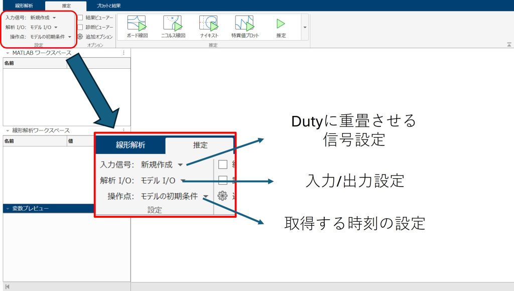 クリックすると、図6のとおりモデル線形化アプリが立ち上がります。この中で、周波数応答を推定するには、左上の三か所を設定する必要があります。以下、設定方法を説明します。