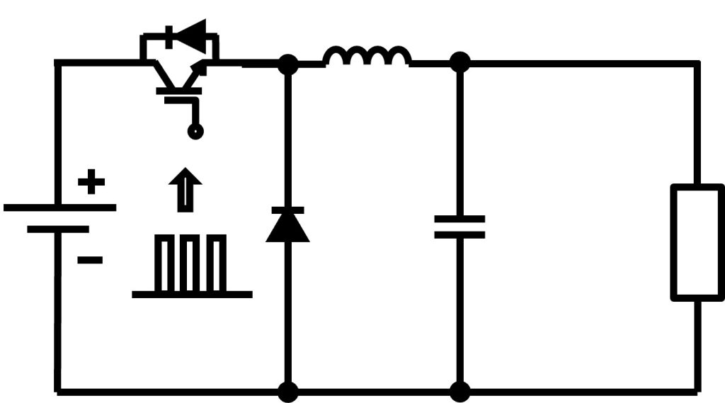 降圧コンバータの出力波形を図1に示します。半導体スイッチを用いて矩形波を生成した後は、LCフィルタを通過させ、直流出力を生成します。このとき、直流出力は完全には平滑化できず、若干の振動成分を持ちます。この振動をリップルと呼びます。ここでは振動の大きさを抑制するためにどのような手法を取ればよいのか考察します。