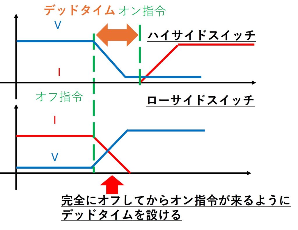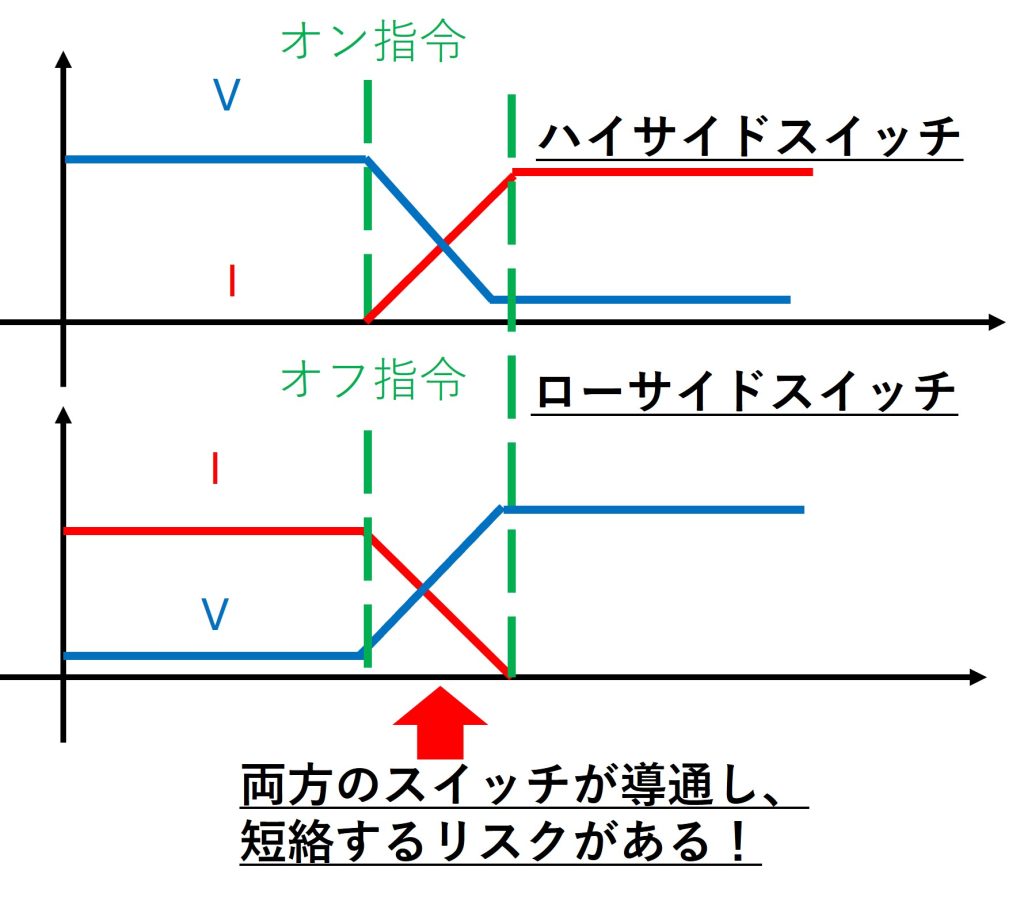 前述の短絡を防止するために、デッドタイムというものを設けることが一般的です。デッドタイムとはハイサイドスイッチ、ローサイドスイッチの双方がOFFになるタイミングのことです。