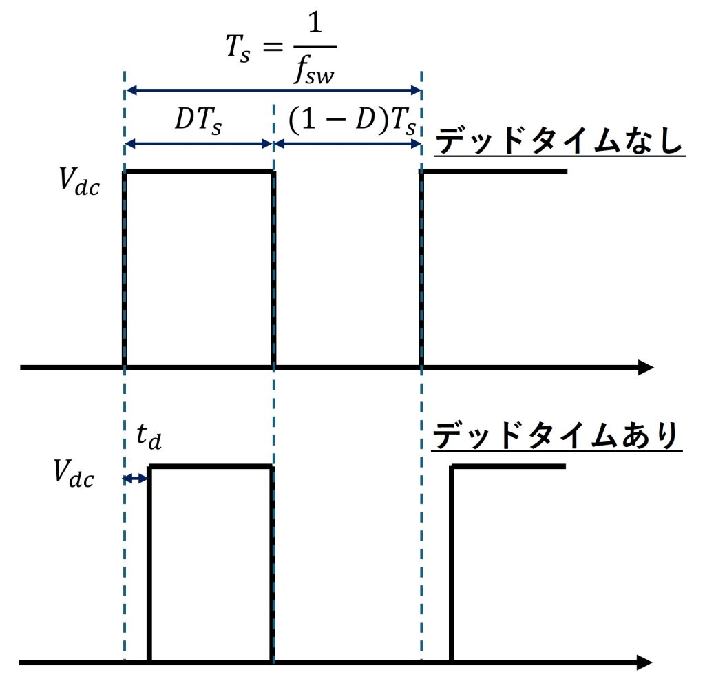 デッドタイムを設けることで短絡を防止することができますが、スイッチング動作が遅れるため、出力電圧が低下します。この低下分を補償するように制御をかける必要があります。ここでは、どれだけ電圧が低下するか計算します。