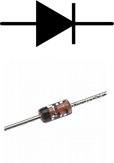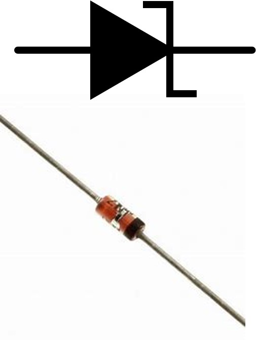 上述の特性を持った、一般的なダイオードを汎用ダイオードと呼びます。回路記号と電子部品の概形を図10に示します。