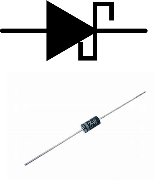 ダイオードは逆方向電圧を印加すると、降伏現象が発生します。これを積極的に使用するダイオードをツェナーダイオードといいます。回路記号と電子部品の概形を図12に示します。