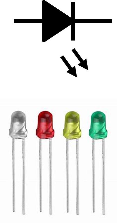 電流が流れることで光を発生する素子になります。いわゆるLEDです。回路記号と電子部品の概形を図13に示します。