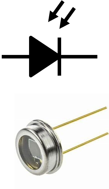 光により電流が流れる素子になります。回路記号と電子部品の概形を図14に示します。