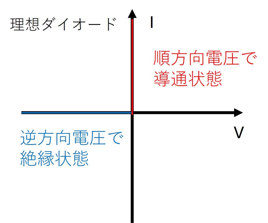 ダイオードの電流と電圧の間の関係を整理します。理想ダイオードと実際のダイオードのI-V特性を図3,4に示します。I-V特性について、V>0の導通特性とV<0の素子特性に分けて整理します。