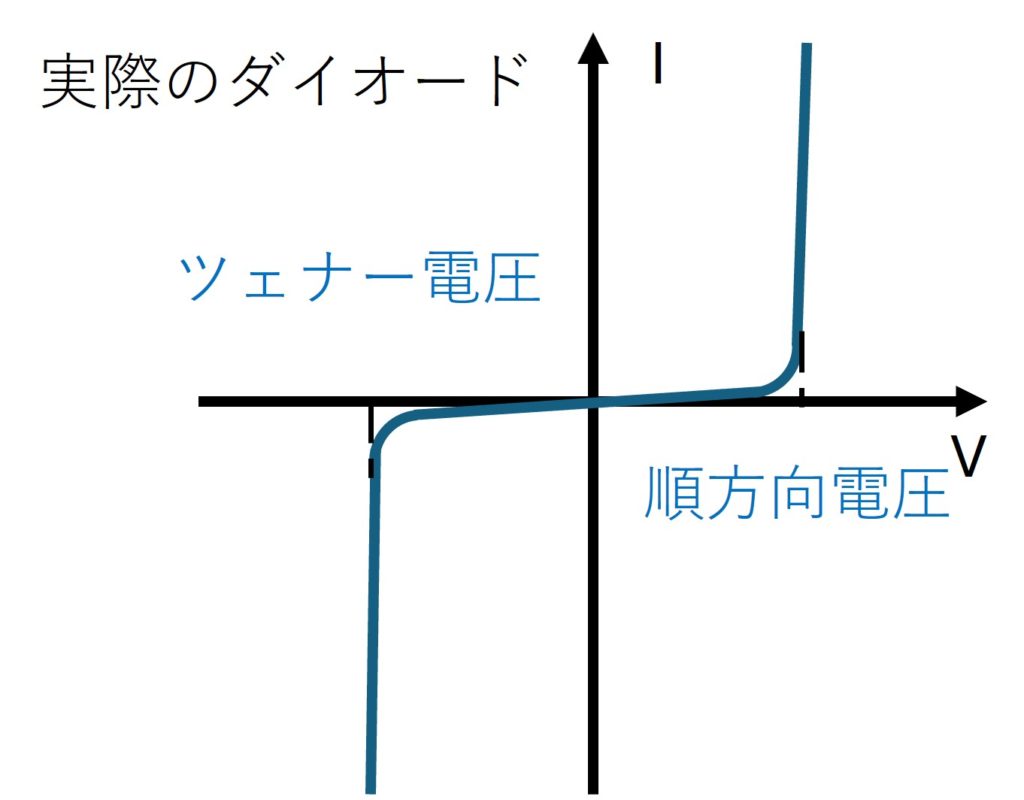 また、実際のダイオードに対して大きな逆方向電圧を印加すると、導通するようになります。この時の電圧をツェナー電圧といいます。導通する原理はツェナー降伏とアバランシェ降伏の2種類あります。どちらが優先的かというのは、素材によります。