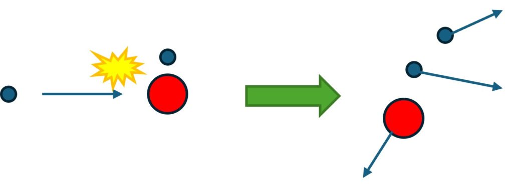 アバランシェ降伏は電界が大きくなり、キャリアの速度が増加することが原因となります。図6のイメージです。キャリアの速度が増加すると、格子と衝突した際に新たな電子と正孔が発生します。この動作が繰り返されることで、キャリアがどんどん増えて導通するようになります。