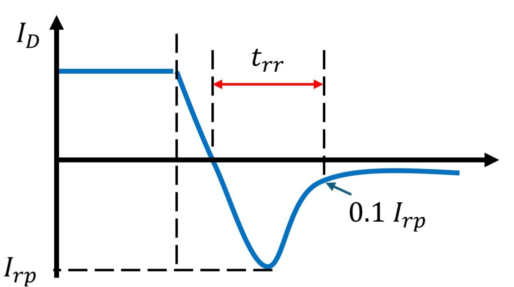 この時、ダイオード電流が0Aになったタイミングから、電流ピークを越え0.1Irpになったタイミングまでを逆回復時間と呼び、trrと記載します。