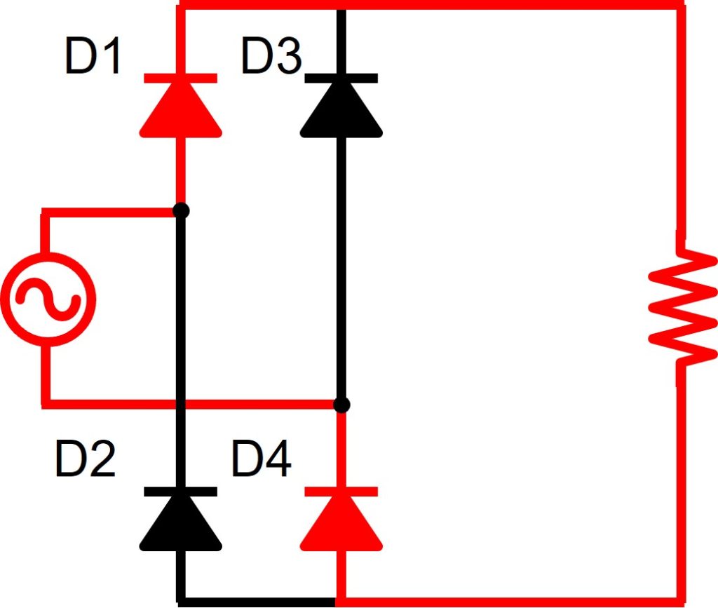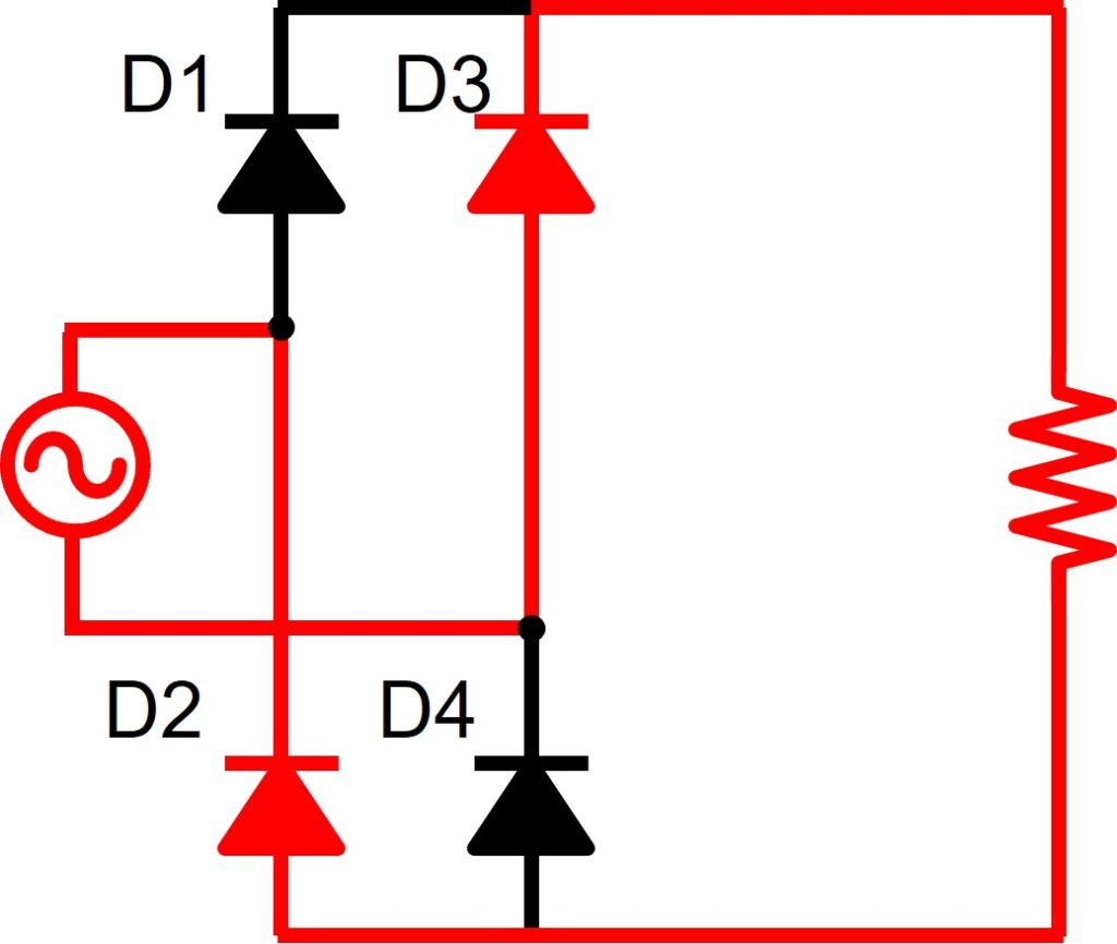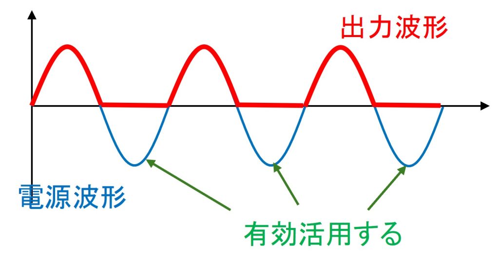 図5のとおり、交流電源がプラスの時、交流電圧を通過させます。つまり、図4のD1が導通します。交流電源がマイナスの時、電圧0[V]を通過させます。つまり図4のD3が導通します。
