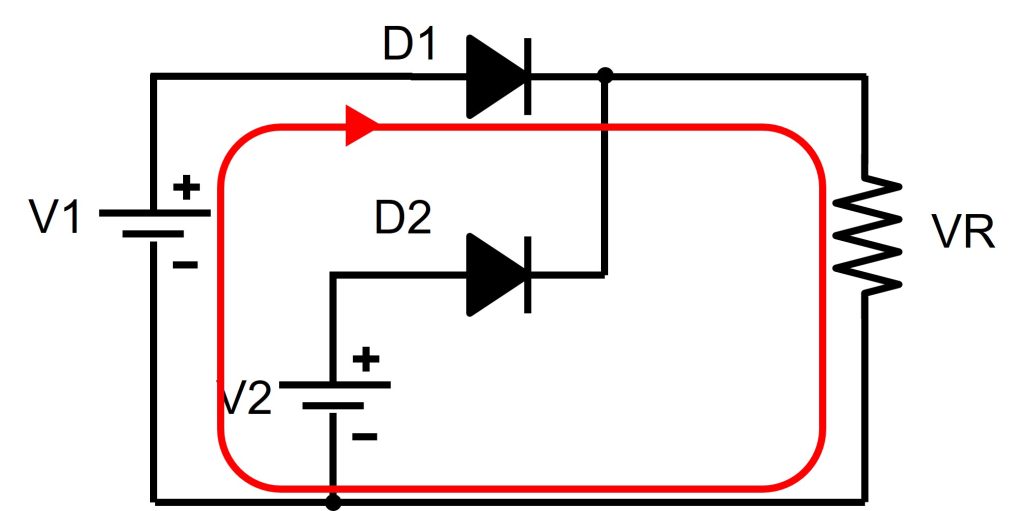 図2の回路を考えます。アノード電圧V1のダイオードD1とアノード電圧V2のダイオードD2がカソード側で接続されています。この時カソード電圧VRがどうなるかを考えます。ただし、V1>V2とします。