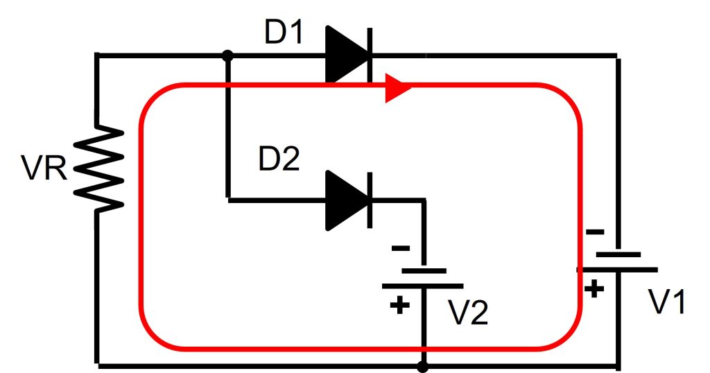 D1回路が存在せず、ダイオードD2の電圧降下を無視すると、アノード電圧VRはダイオードD2のアノード電圧-V2なります。