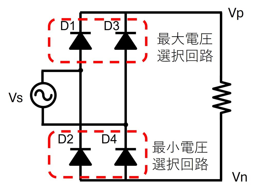 単相全波整流回路の回路は図4のようになります。交流電源と負荷の間に4つのダイオードが配置されています。この回路の上側は先ほどの最大電圧選択回路に相当し、下側は先ほどの最小電圧選択回路になります。