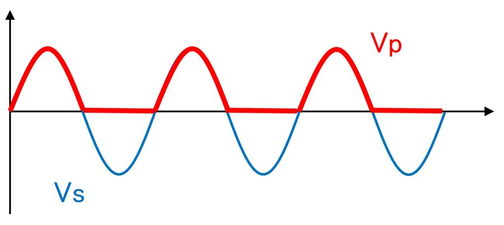 正側出力端子の電圧Vpは交流波形と電圧0[V]の最大値選択となるため、図5のとおり赤色の波形が出力されます。
